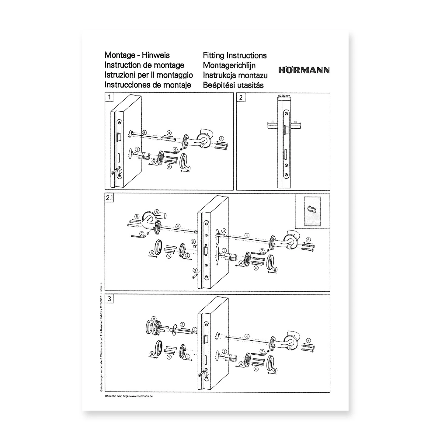 Hinweis: Beachten Sie, dass Feuerschutztüren für eine Rosettengarnitur vorgerichtet sein müssen. Ein Wechsel von Kurzschild auf Rosetten kann nicht ohne Weiteres erfolgen. Beachten Sie hierzu die Angaben in der gültigen bauaufsichtlichen Zulassung der Brandschutztür.