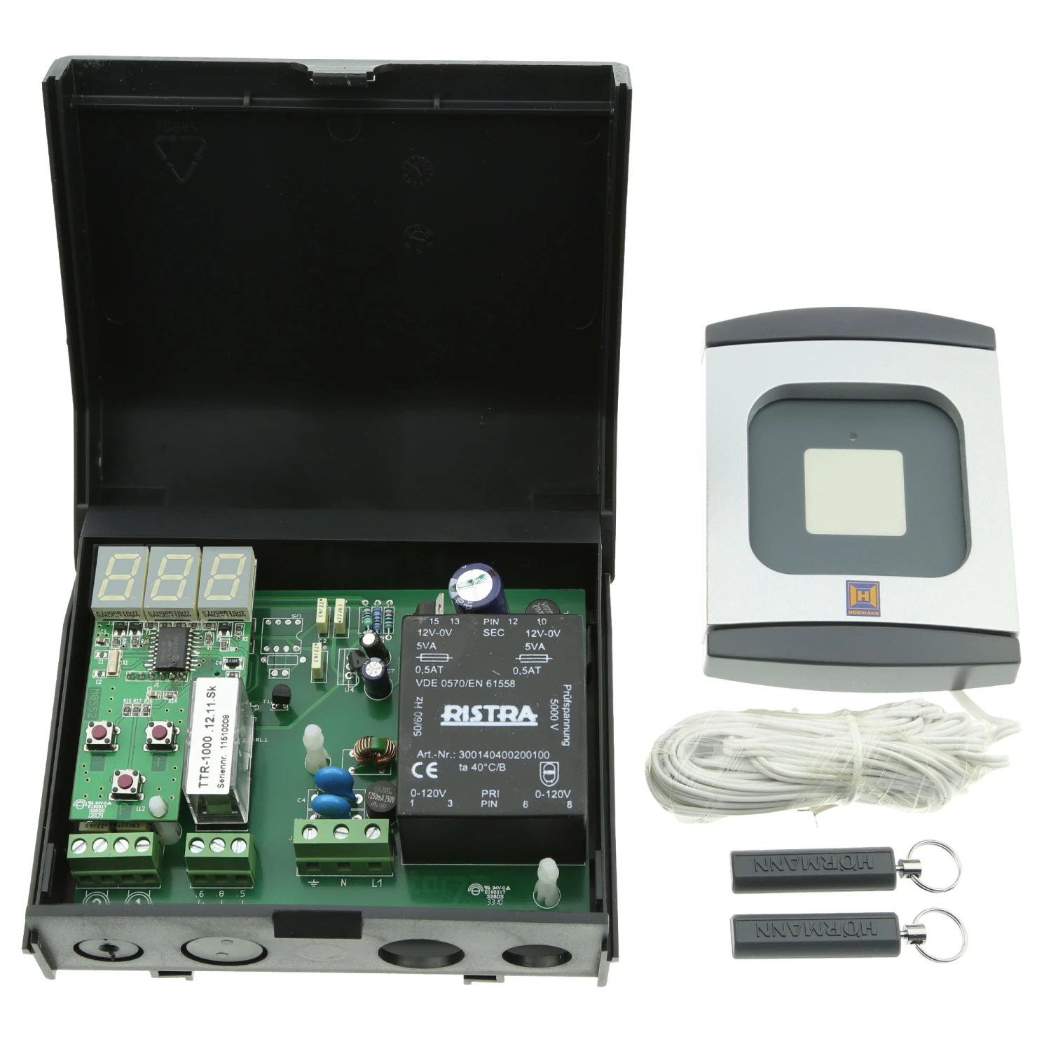 An eine Auswerteinheit können zwei Leseeinheiten angeschlossen werden. Dies ist sinnvoll, wenn der entsprechende Antrieb von zwei verschiedenen Stellen aus angesteuert werden soll, beispielsweise bei der Einfahrt und bei der Ausfahrt. Sie werden mit einer Spannung von 230 V betrieben. Der TTR 1000 ist kompatibel mit allen Hörmann-Modellen der Serien 1,2 und 3.