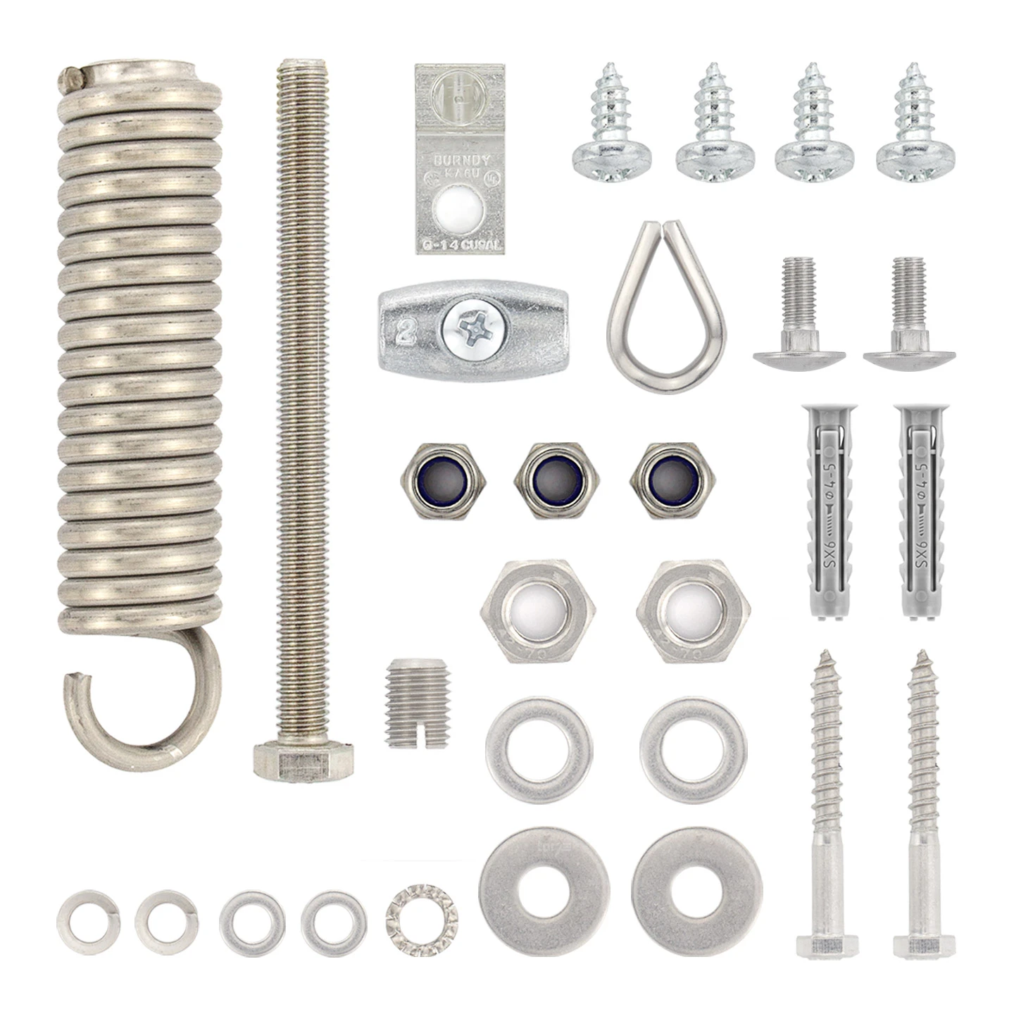 Damit diese Sicherheitskontaktleisten funktionieren und auch mit dem Antrieb kommunizieren können sind die zugehörigen Komponenten des Einbausets Hörmann Anschlusseinheit SKS Schließkantensicherung (Art-Nr. 436225) erforderlich. Hierzu gehören unter anderem die SKS Platine im Gehäuse, das Spannseil und der Spulenkern im Gehäuse. Hinzu kommen die beiden Befestigungswinkel am Torflügel für das Seil sowie die zweiteilige Bodenbefestigung der Platine. All diese Teile müssen jedoch miteinander, am Boden oder auch am Torflügel, befestigt werden. Hierfür sind zahlreiche Dübel, Schrauben, Muttern und Unterlegteile nötig. Für das Spannseil wird zudem eine Feder, eine Kausche sowie eine Verschraubung als Erdung benötigt. Dementsprechend wird immer ein Zubehörbeutel Anschlusseinheit SKS mit allem Montagematerial für den Ersteinbau der Sicherheitseinrichtung mitgeliefert.